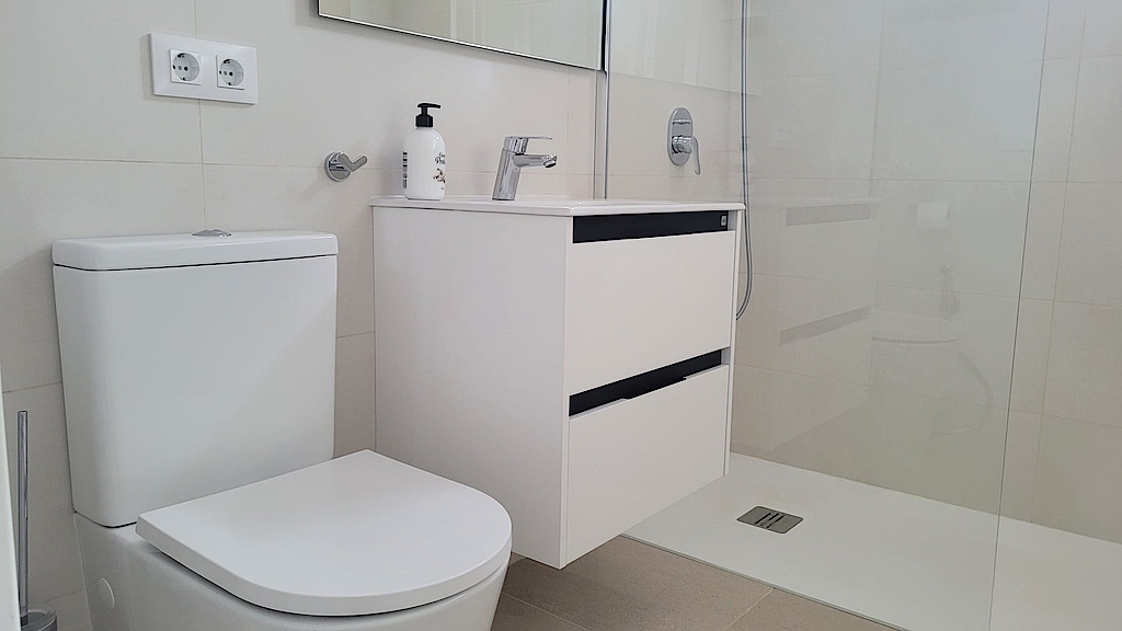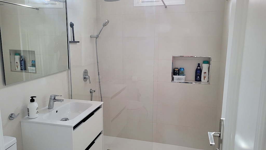 Im Bad finden Sie außer WC und Waschbecken eine Duschbadewanne sowie eine Waschmaschine.