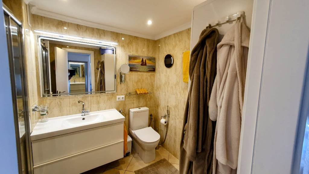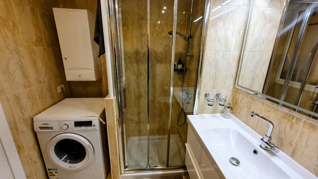 Im Bad finden Sie eine Dusche, ein Waschbecken mit Unterschrank, Toilette, einen Hochschrank sowie eine Waschmaschine.